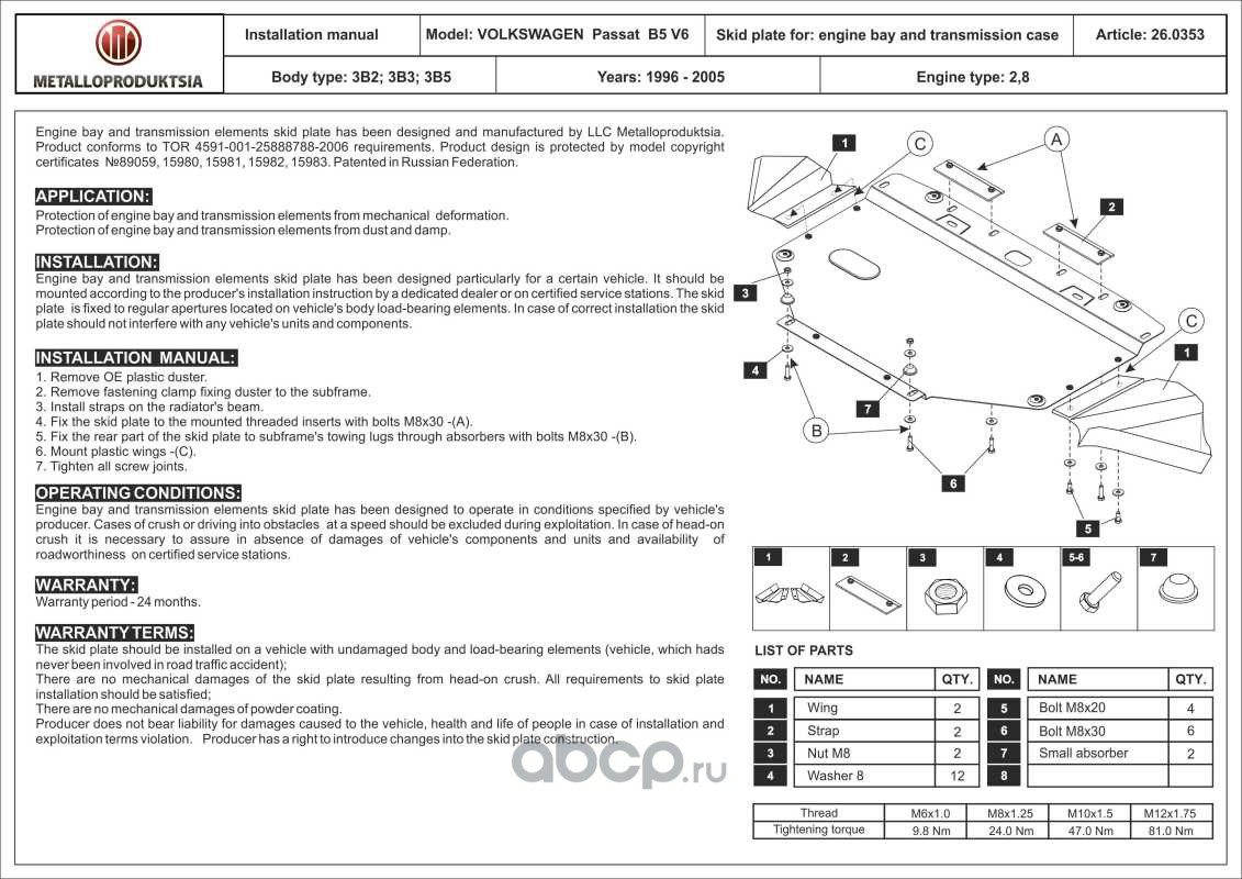 Защита картера и КПП для VOLKSWAGEN Passat B5, 1996-2005, 3B2; 3B3; 3B5, сталь 2,0 мм