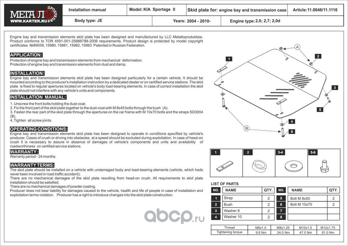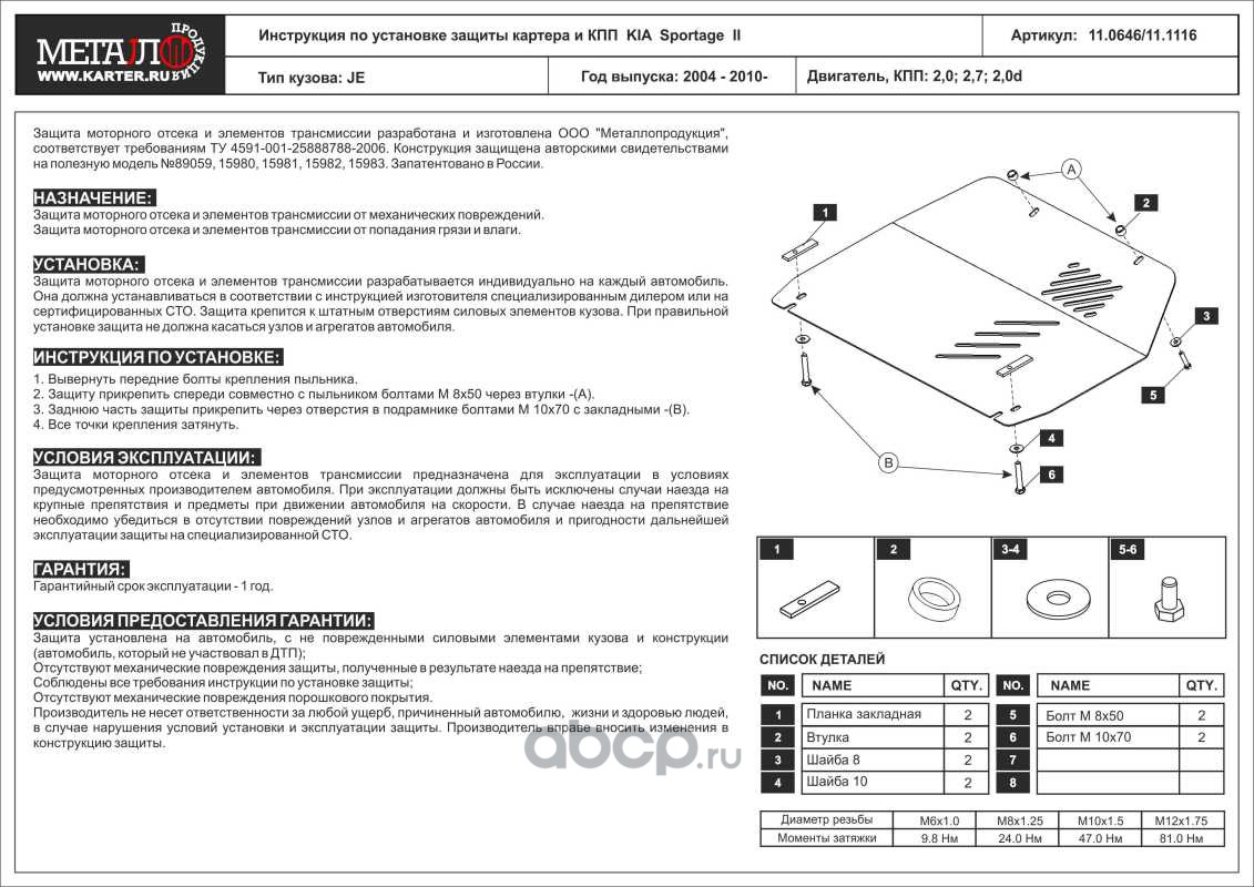 | SHERIFF | 110646 | Защита картера и КПП для KIA Sportage, 2004-2010, JE, сталь 2,5 мм | ||