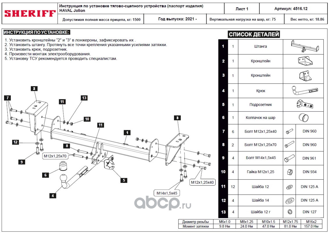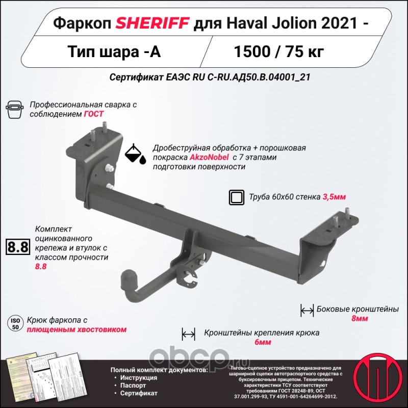 ТСУ для HAVAL Jolion 2021 - ,Тип шара- A,, Горизонт / Верт нагрузка на шар 1 500 / 75