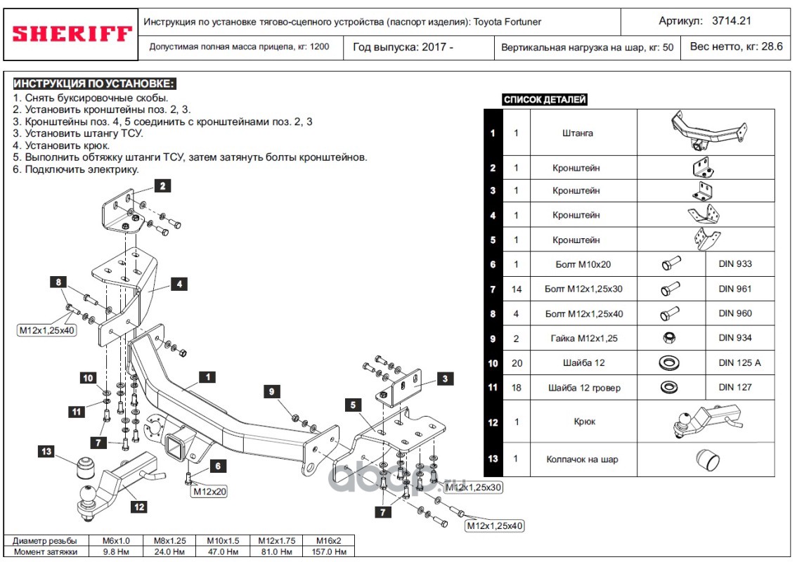 ТСУ для TOYOTA Fortuner 2017 - ,Тип шара- E,, Горизонт / Верт нагрузка на шар 2 800 / 120