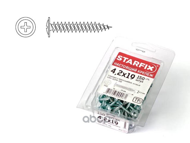 | STARFIX | SMP132770150 | Саморез 4.2х19 мм с прессшайбой, цинк, острый (150 шт в пласт. конт.) | ||