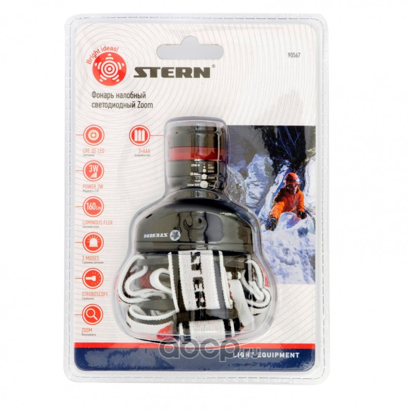 Фонарь наголовный Zoom, 3 W Led CRE Q5, 160Лм, 100 м, 3 режима: 100%-50%-строб, 3 х ААА Stern