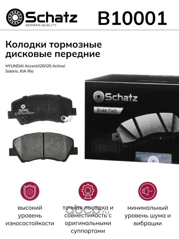 | Schatz | B10001 | Колодки тормозные дисковые передние HYUNDAI Accent/i20/i20 Active/Solaris, KIA Rio | ||