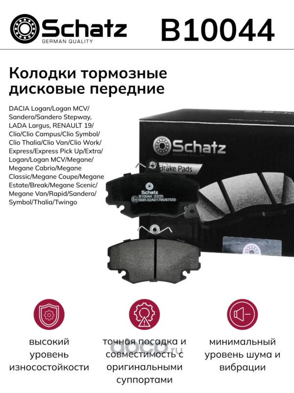 | Schatz | B10044 | Колодки тормозные дисковые передние DACIA Logan/Logan MCV/Sandero/Sandero Stepway | ||