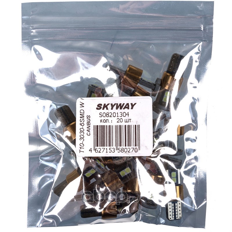 Автолампа диод T10 6 диодов без цоколя 1-конт Белая SKYWAY стоп-сигналы, задние противотуманные фары