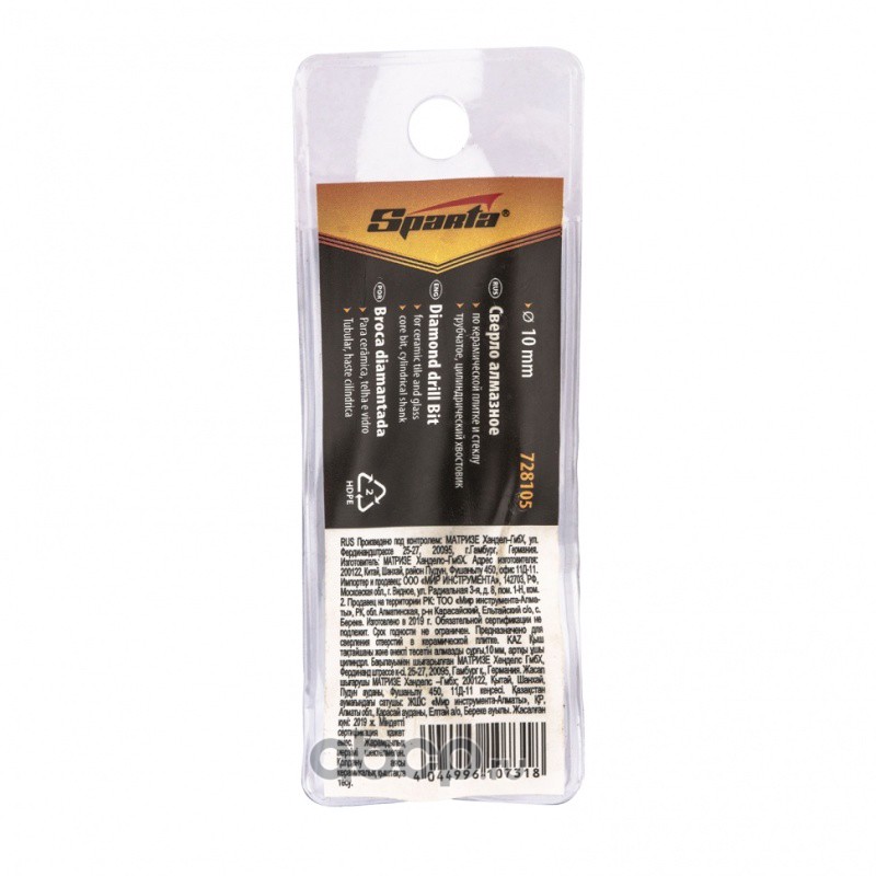 Сверло алмазное по керамической плитке и стеклу, 10 мм, цилиндрический хвостовик Sparta