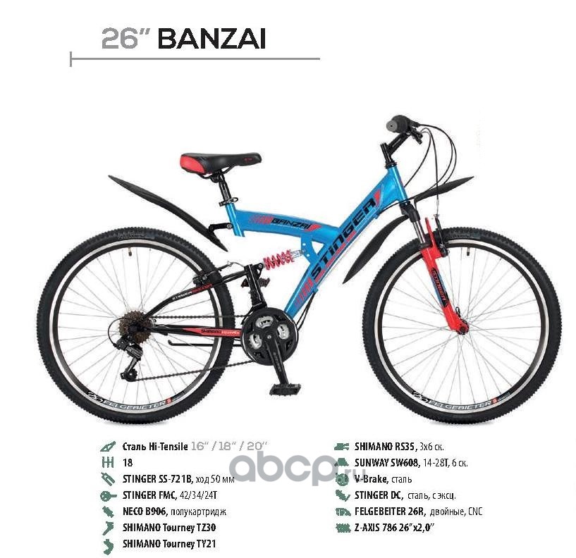 Stinger 26SFVBANZAI18BL7 Велосипед 26 горный STINGER Banzai (2017) количество скоростей рама сталь 18 синий
