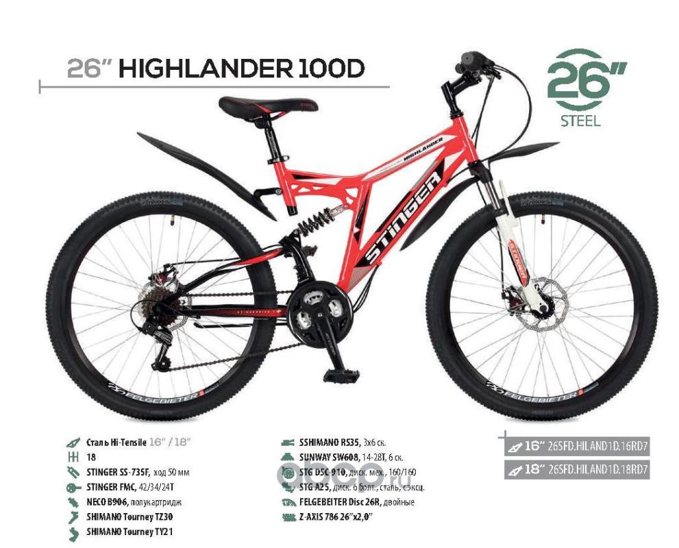 Stinger 26SFDHILANDISC16BK8 Велосипед 26 горный STINGER Highlander D (2018) количество скоростей 18 рама сталь 16 черный