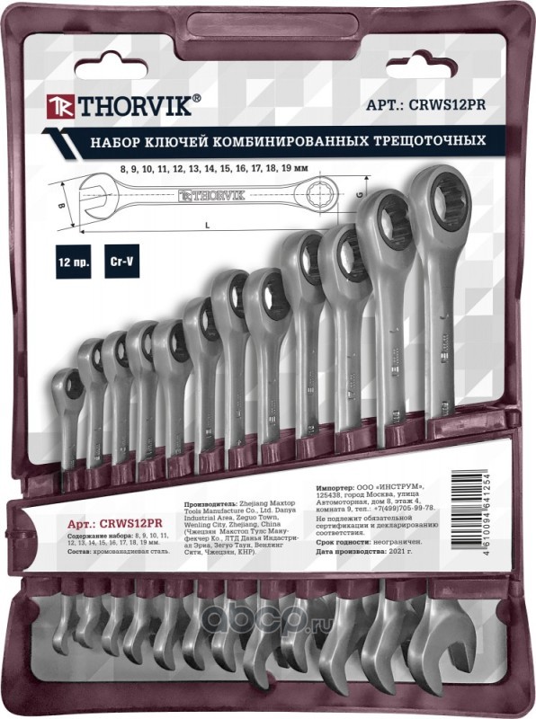 Набор ключей гаечных комбинированных трещоточных на держателе, 8-19 мм, 12 предметов