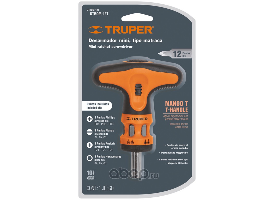 | TRUPER | 14194 | Миниотвертка с храповым механизмом плюс 12 бит, т-образная ручка DTROM-12T | ||