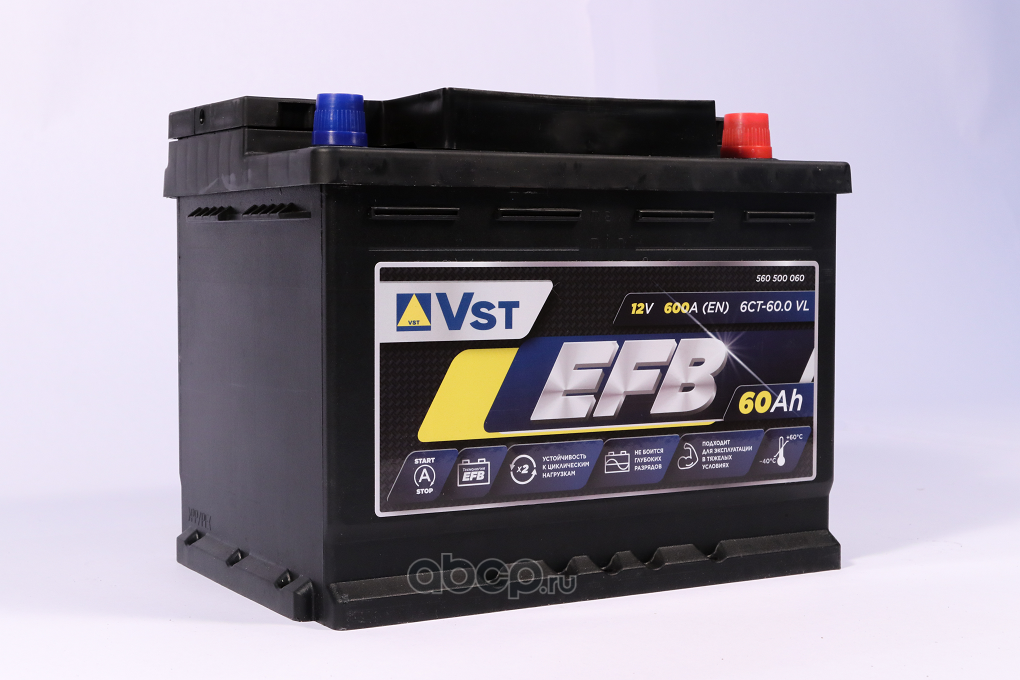 | VST | 560500060 | Батарея аккумуляторная 60А/ч 600А 12В обратная полярн. стандартные (Европа) клеммы | ||