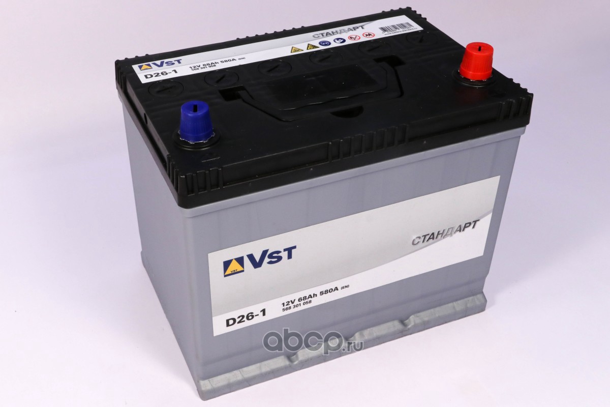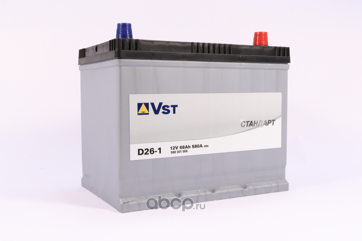 | VST | 568301058 | Батарея аккумуляторная 68А/ч 580А 12В обратная полярн. выносные (Азия) клеммы | ||