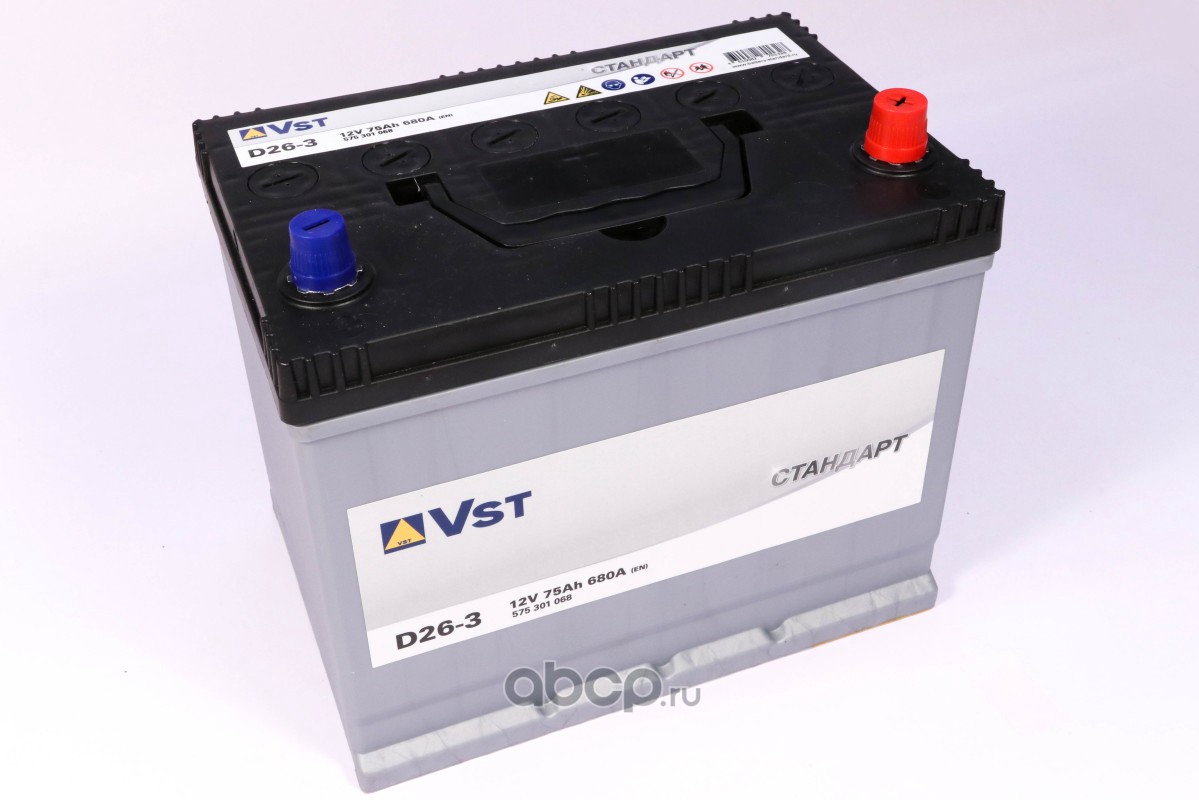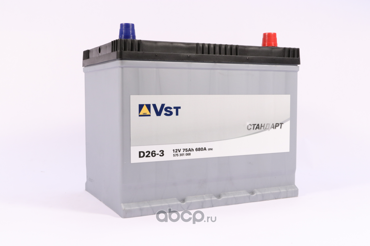 | VST | 575301068 | Батарея аккумуляторная 75А/ч 680А 12В обратная полярн. выносные (Азия) клеммы | ||