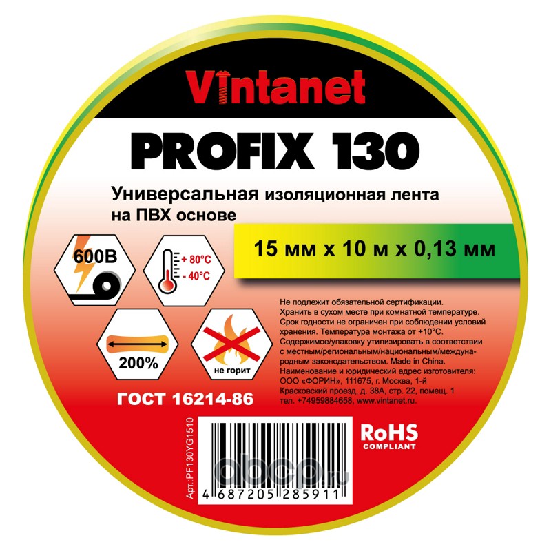 | Vintanet | PF130YG1510 | Изолента ПВХ универсальная желто-зеленая PROFIX130 15мм x 10м | ||