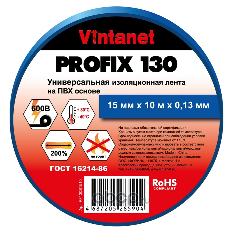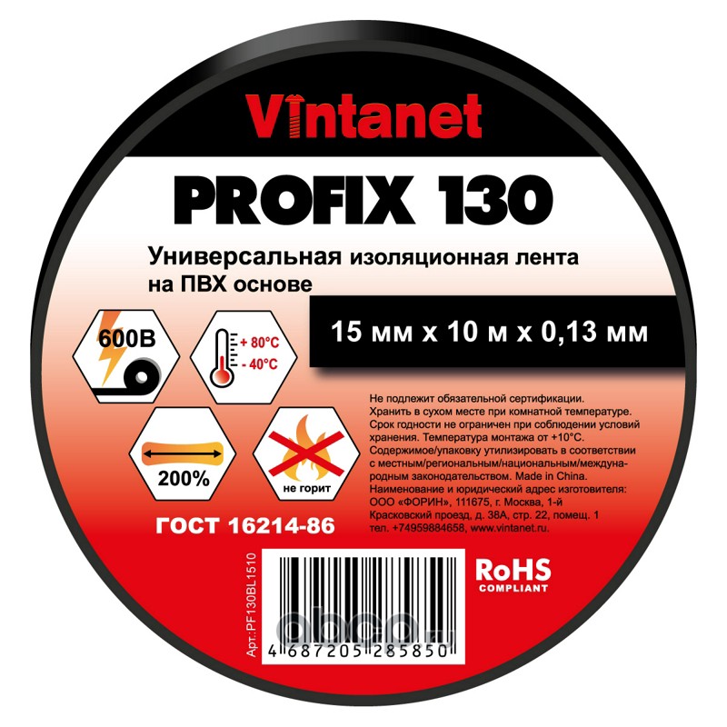 | Vintanet | PF130BL1510 | Изолента ПВХ универсальная черная PROFIX130 15мм x 10м | ||