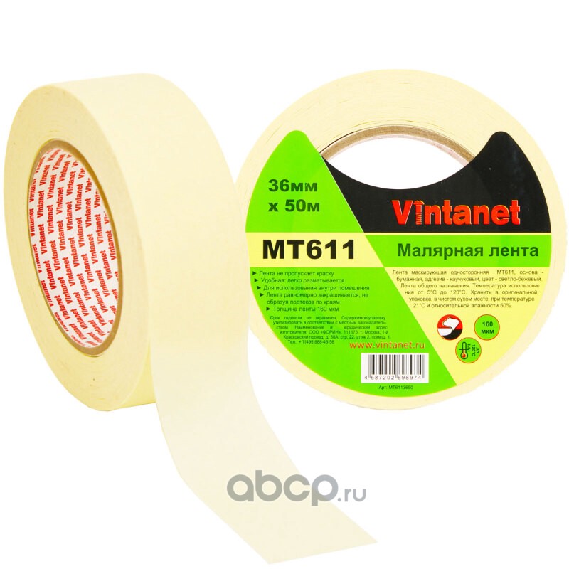 | Vintanet | MT6113650 | Лента малярная 120°С 160мкм MT611 36мм х 50м | ||
