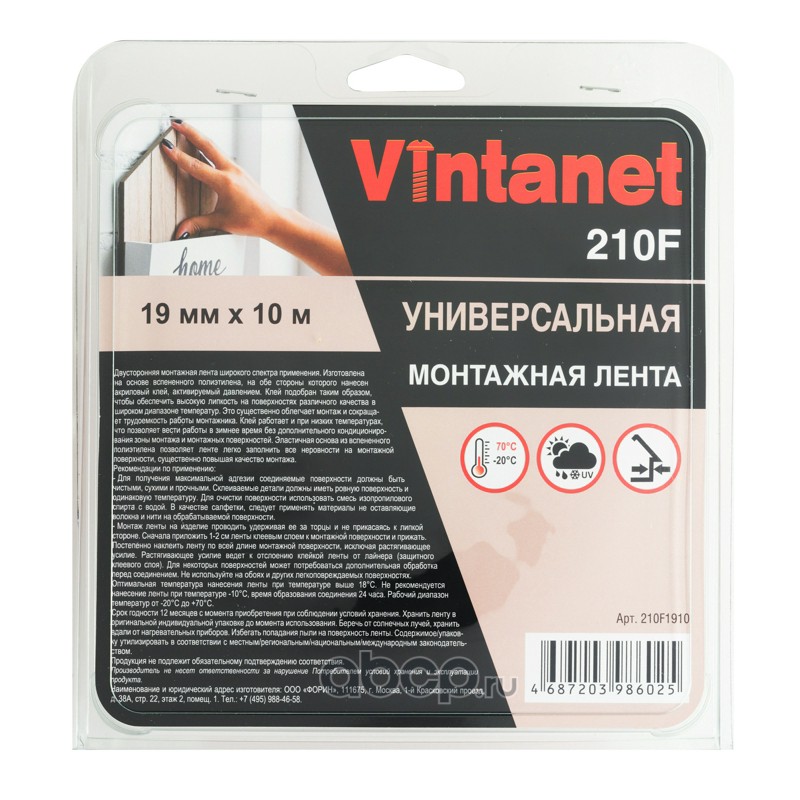 | Vintanet | 210F1910 | Лента двусторонняя универсальная для наружных и внутренних работ 210F 19мм х 10м | ||