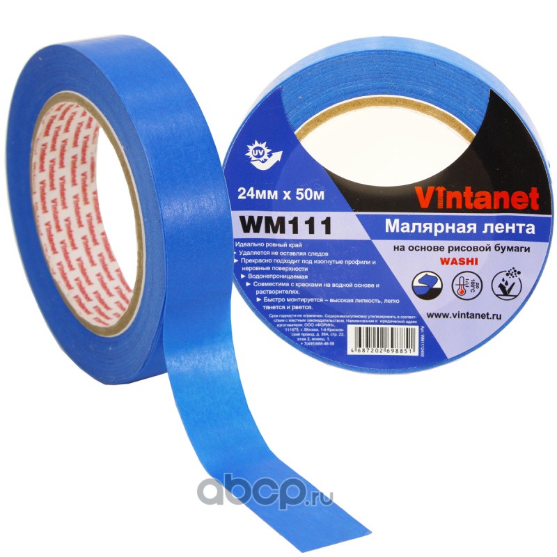 | Vintanet | WM1112450 | Лента малярная на основе рисовой бумаги Washi для четкого края синяя WM111 24мм х 50м | ||