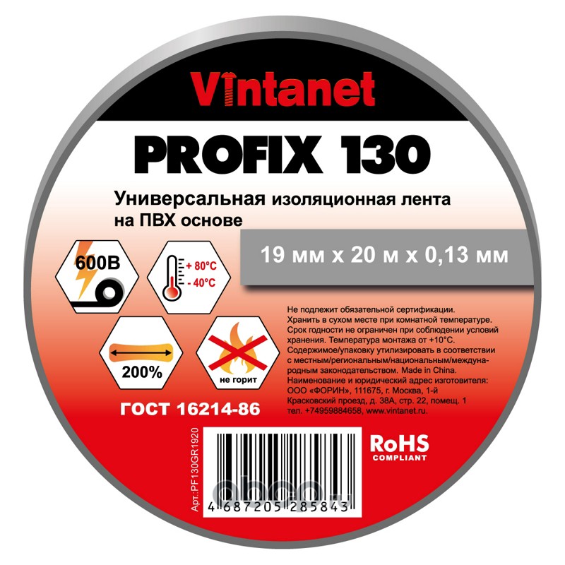 | Vintanet | PF130GR1920 | Изолента ПВХ универсальная серая PROFIX130 19мм x 20м | ||