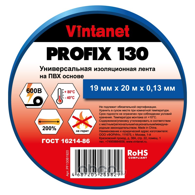 | Vintanet | PF130B1920 | Изолента ПВХ универсальная синяя PROFIX130 19мм x 20м | ||