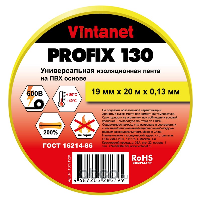 | Vintanet | PF130Y1920 | Изолента ПВХ универсальная желтая PROFIX130 19мм x 20м | ||