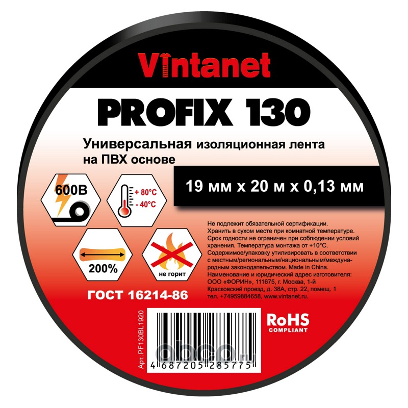 | Vintanet | PF130BL1920 | Изолента ПВХ универсальная черная PROFIX130 19мм x 20м | ||