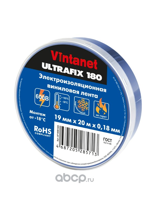 | Vintanet | UF180B1920 | Изолента виниловая морозостойкая синяя ULTRAFIX180 19мм х 20м | ||