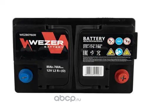 | WEZER | WEZ80760R | Батарея аккумуляторная 80А/ч 760А 12В обратная полярн. стандартные клеммы | ||