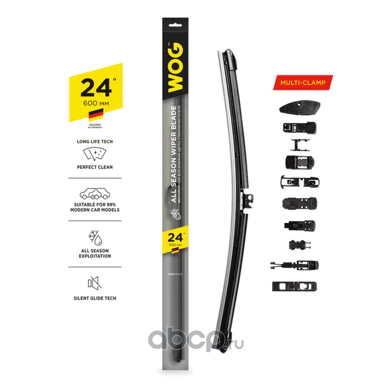 Щетка стеклоочистителя всесезонная бескаркасная, бесшумная 24’’ с комплектом адаптеров (10 шт.) WOG, 1 шт