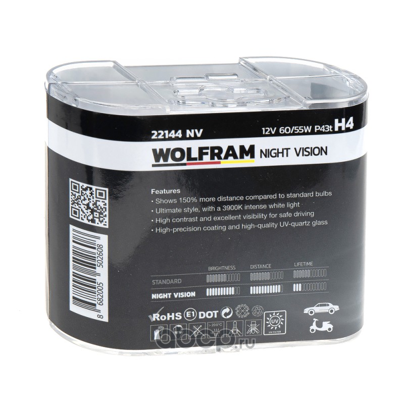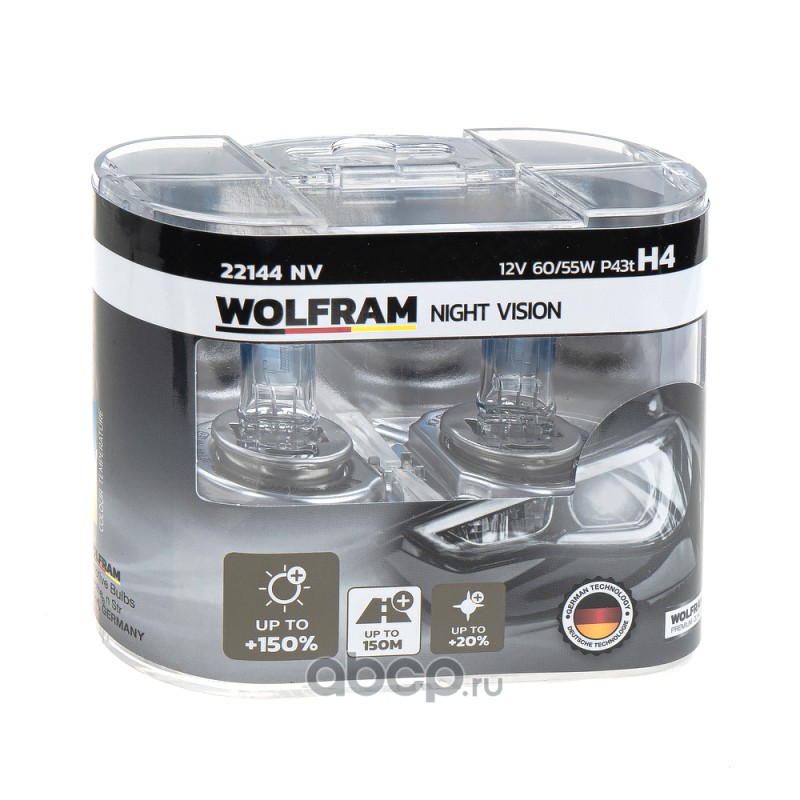 | WOLFRAM | 22144NV | Лампа галогенная WOLFRAM NIGHT VISION +150% EXTRA LIGHT + 20% WHITER H4 P43t 12V 60/55W 2 шт. | ||