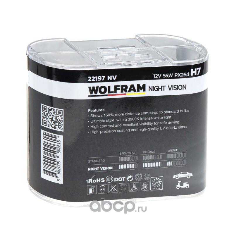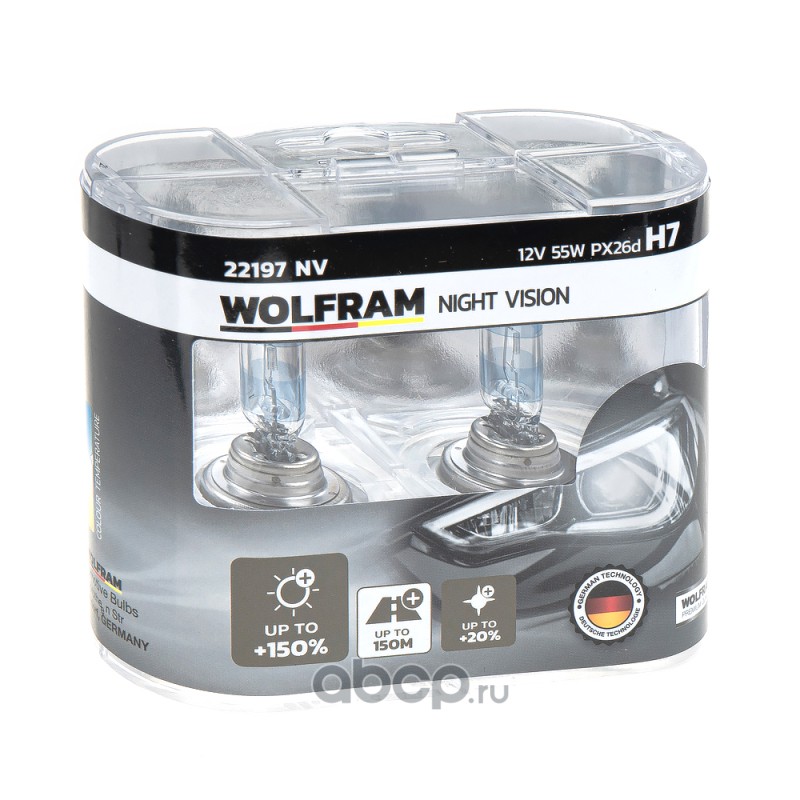 | WOLFRAM | 22197NV | Лампа галогенная WOLFRAM NIGHT VISION +150% EXTRA LIGHT + 20% WHITER H7 PX26d 12V 55W 2 шт. | ||