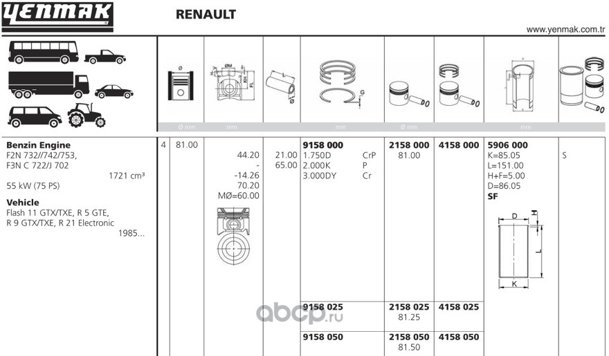 | YENMAK | 4158000 | Ø81,00 STD Поршень с кольцами + палец | ||