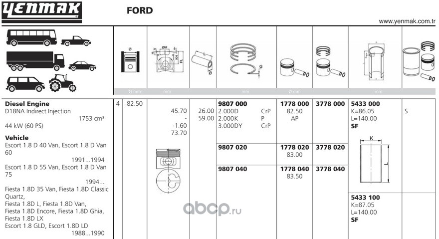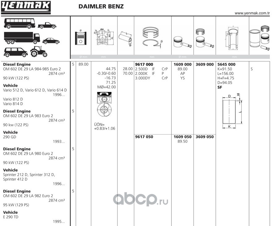 | YENMAK | 1609050 | Ø89,50 Поршень + палец без колец | ||