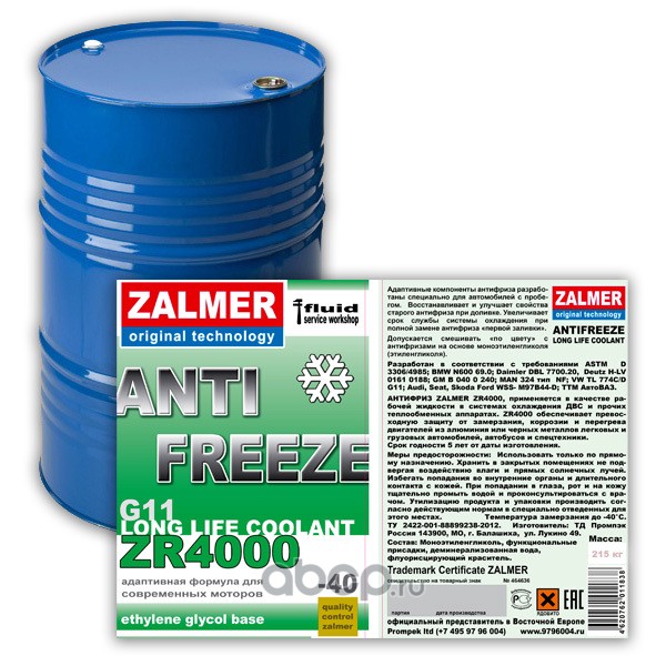 | ZALMER | ZR40G215 | Antifreeze ZR4000 LLC G11 (зеленый) 215л | ||