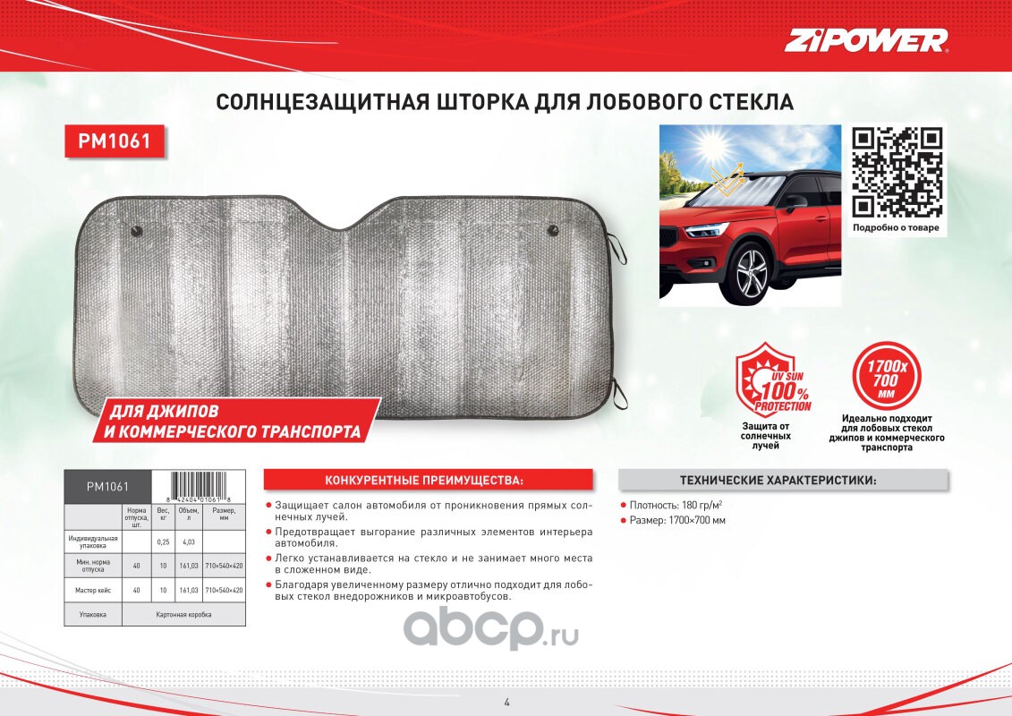 Солнцезащитная шторка для лобового стекла, 1700х700 мм, 180 г