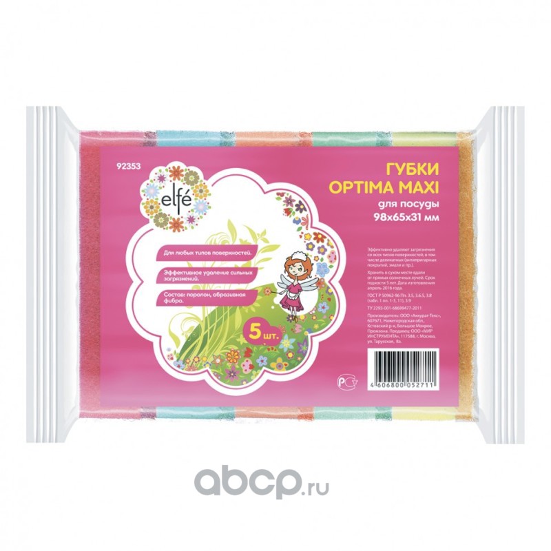 Губки для посуды Optima MAXI, 98 х 65 х 31 мм, 5 шт, Россия Elfe