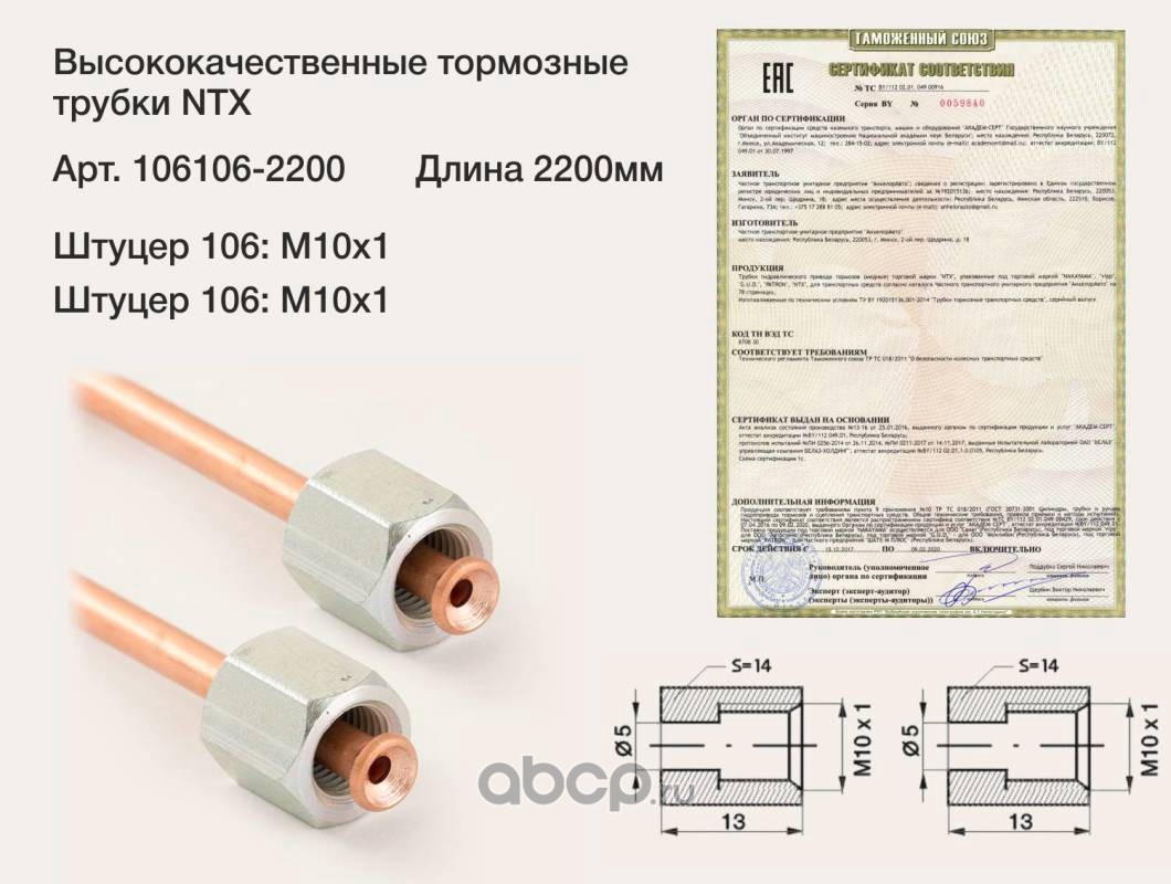 | ntx | 1061062200 | Трубка тормозная медная, штуцер М10х1/М10х1 L=2200мм | ||