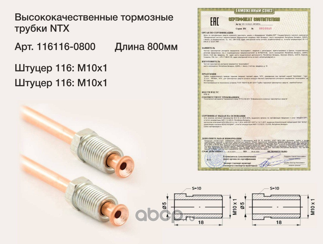 Трубка тормозная медная, штуцер М10х1/М10х1 L=800мм (аналог WP-102)