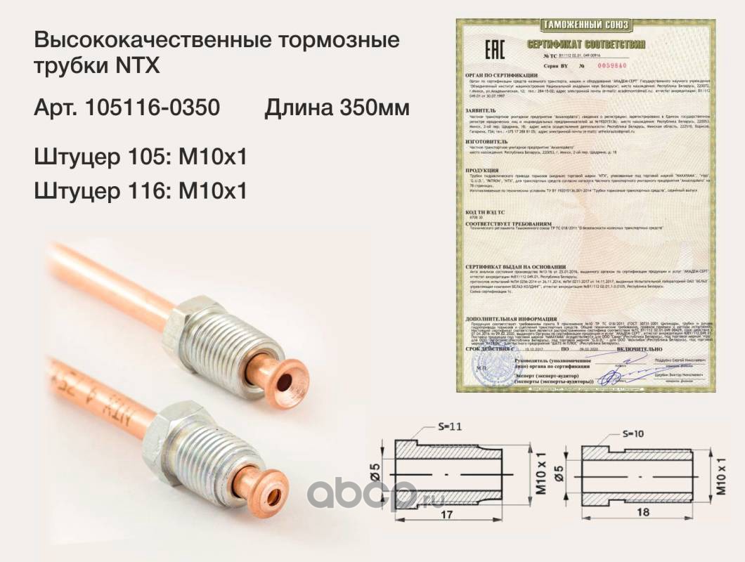 Трубка тормозная медная, штуцер М10х1/М10х1 L=350мм (аналог WP-354)