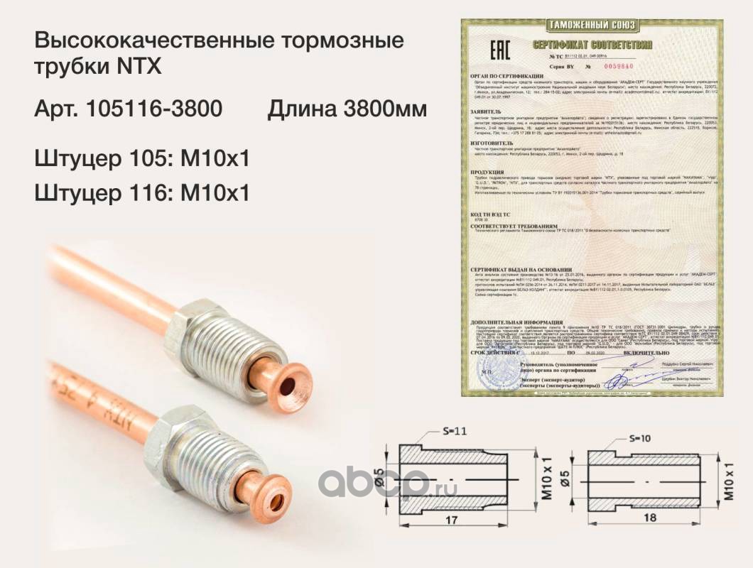 Трубка тормозная медная, штуцер М10х1/М10х1 L=3800мм (аналог WP-352)