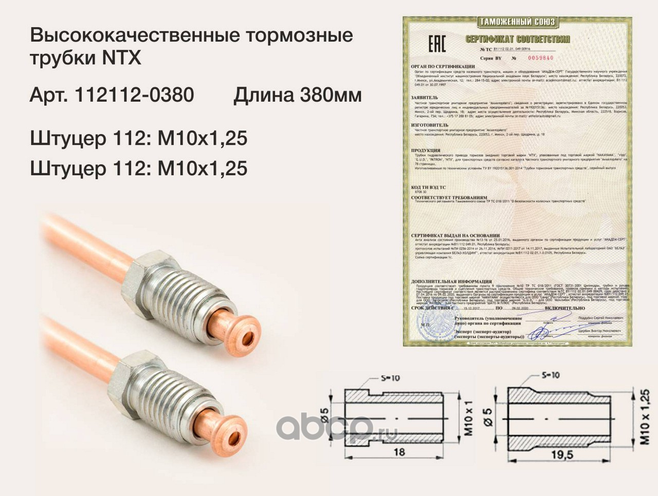 Трубка тормозная медная, штуцер LADA М10х1,25/М10х1,25 L=380мм (WP-1664)