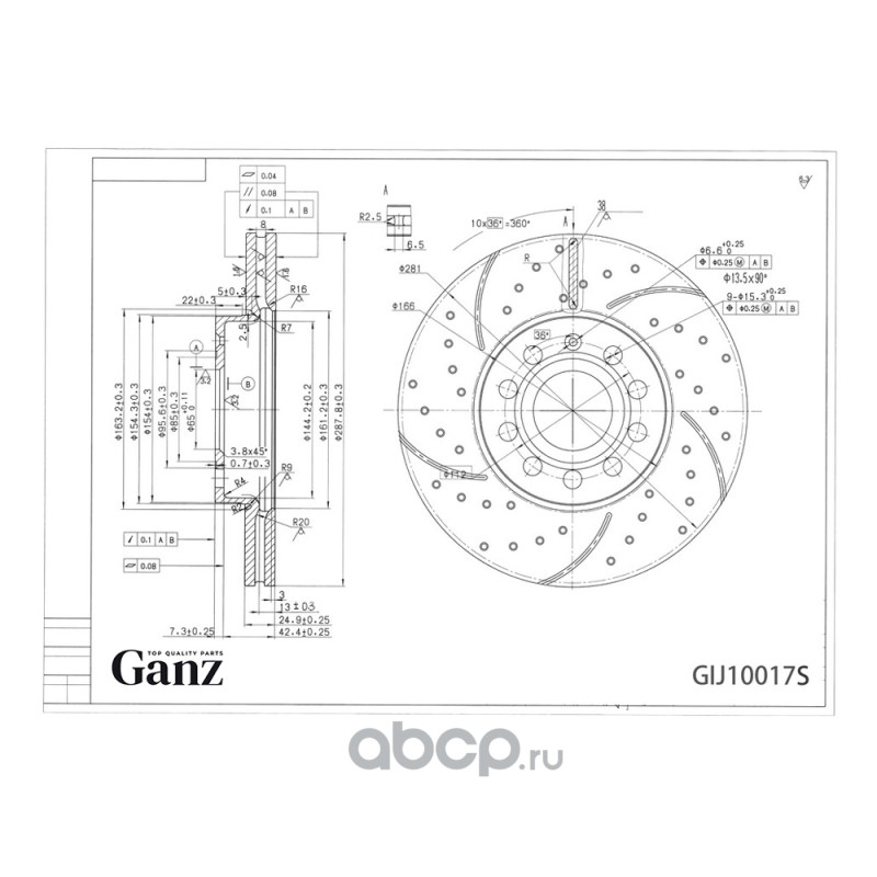 GANZ | GIJ10017S | Диск тормозной передний S-Line с покрытием VAG+Skoda all 03-> /Vent D=288mm |