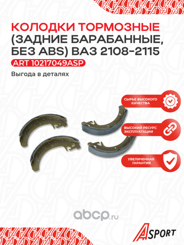 A-SPORT | 10217049ASP | Колодки задние тормозные для а/м ВАЗ 1117-19; 2108-099; 2110-12; 2113-2115;2170-72; 2190-94, без ABS, компл. 4 шт., барабанные |